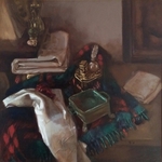 2002Olieverfschilderij van voorwerpen op de vensterbank, waaronder een Russische samowar