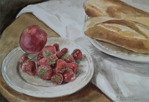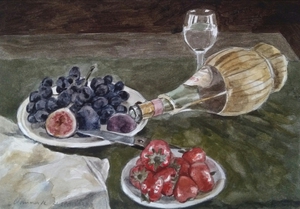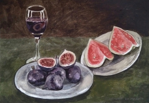 2020Aqaurel met een glas druivensap, vijgen en een meloen