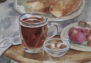 2020Stilleven met kop thee, fruit en broodjes