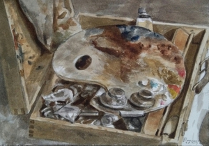 2020Stilleven van schilderspalet op schilderskist