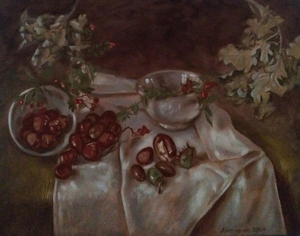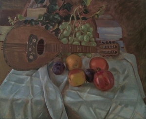2020Olieverfschilderij met mandoline, fruit, klimop en boeken