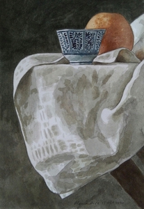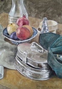 2020Aquarel met doeken, fruit in een schaal en een metalen doosje