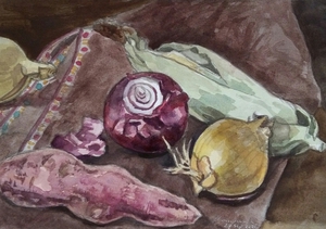 2020Aquarel van uien, maïs en rode aardappel