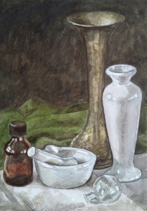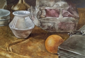 2020Aquarel met glas water, glazen vaas, fruit, metalen doosje en koperen schenkkan