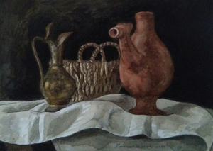 2020Stilleven met koperen en aardewerken kruikje en rieten mandje