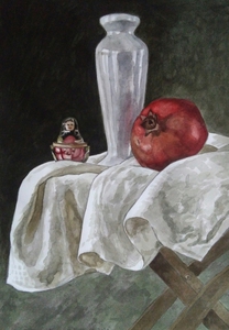 2020Aquarel met matroesjka, granaatappel en wit porseleinen vaasje