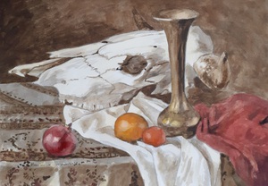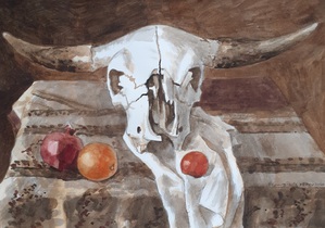 2020Aquarel met stilleven van stierenschedel en koperen vaasje