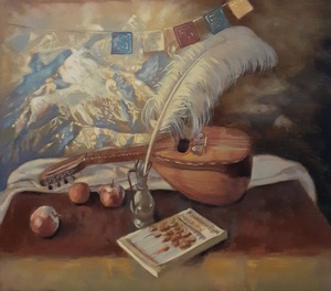 2020Olieverfschilderij met mandoline, Tien-shan gebergte en Tibetaanse gebedsvlaggen