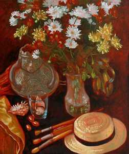2022Stilleven met precolumbiaanse kruik en chrysanten en hoed