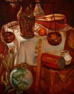 2021Stilleven met weegschaal, kruik en wereldbol