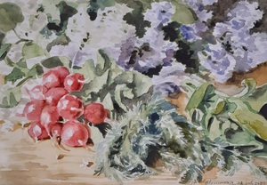 2022Aquarel van keukenstuk met radijs en blauwe seringen