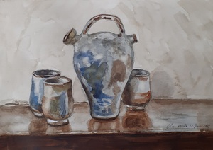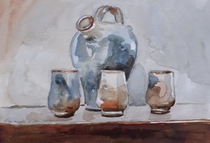 2023Aquarel van kruikje met drie kopjes