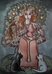 2018Tekening in pen en aquarel van Freya uit de Germaanse mythologie met veren mantel en twee katten