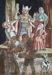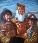 2014Olieverfschilderij van Priester Johan samen met Djenghiz Khan en zijn bruid Börte