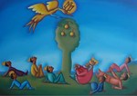2011Schilderij naar het Swahili sprookje van Binti Matlai Shemshi waarin de jongste prins een wonderlijke vogel vangt