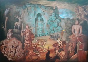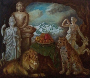 2024Olieverfschilderij met Amitabha en Freya met als thema vergelijkende mythologie
