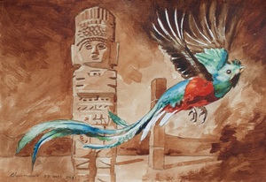 2021Quetzal met op de achtergrond een atlant van Tula, Mexico
