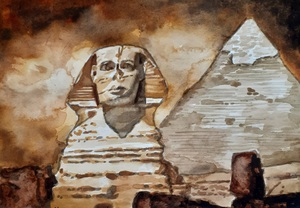 2021Aquarel van de Egyptische Sfinx met op de achtergrond de piramide van Chefren