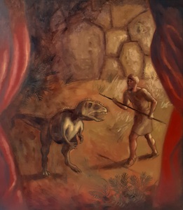2021Olieverfschilderij van De drakendoder, een reus in strijd met een Giganotosaurus met een cyclopische muur op de achtergrond
