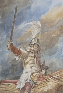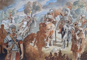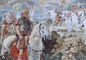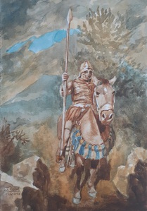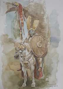 2023Aquarel van een Romeinse ruiter met een drakenbanier