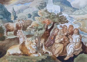 2024Olieverfschilderij met Jeschu en rabbi Jehoshua ben Perachiah in Alexandrië