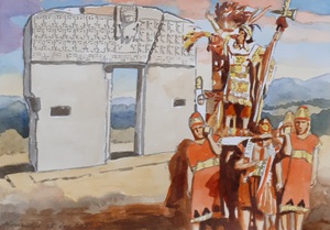 2022Poort van de Zon in Tiwanaku, Bolivia met optocht van Inca-keizer