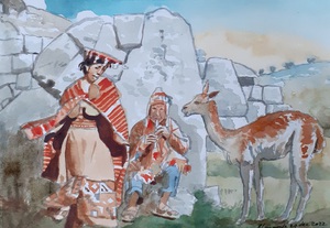 2022Dansende Inca-vrouw met fluitspeler en lama met op de achtergrond een stenen muur in cyclopische stijl