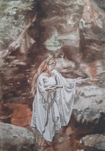 2023Aquarel van de Vrouwe van het Meer, die koning Arthur het zwaard Excalibur aanbiedt