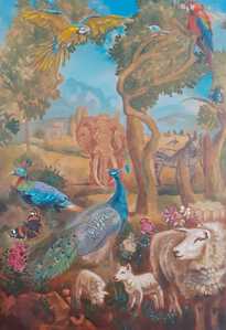 2023Schilderij van Arcadia met verschillende dieren, waaronder een pauw en schaap