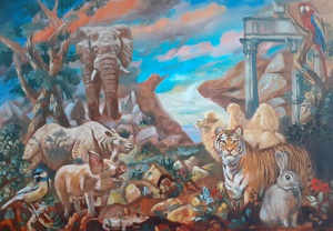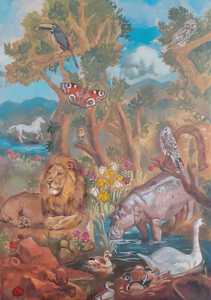 2024Olieverfschilderij van een fantasielandschap met dieren