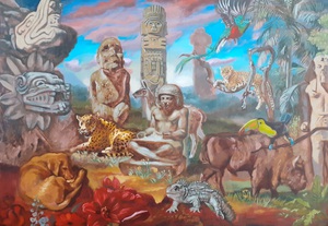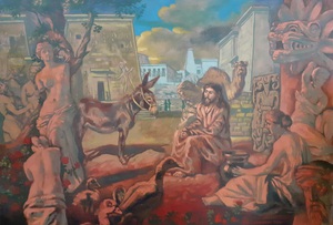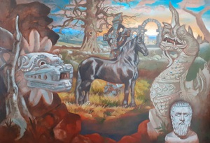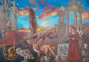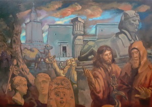 2024Olieverfschilderij met onder meer piéta, Venusbeeld, Gilgamesj en ziggoerat
